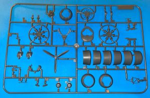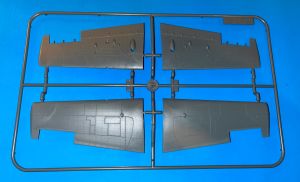 Grumman Wildcats had complex landing gear and the kit captures it very well. The wing spar is integrally molded with the rear wheel wall and the engine mount also attaches to the wall. The landing gear chains are installed here too. The fabric ailerons, rudder and horizontal stabilizers are molded separately and the fabric effect is convincing.