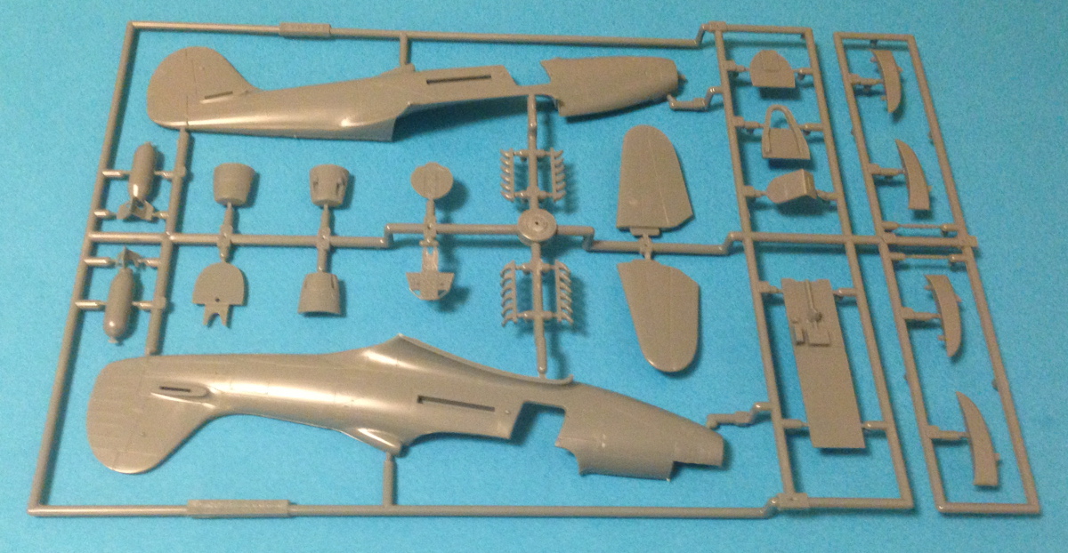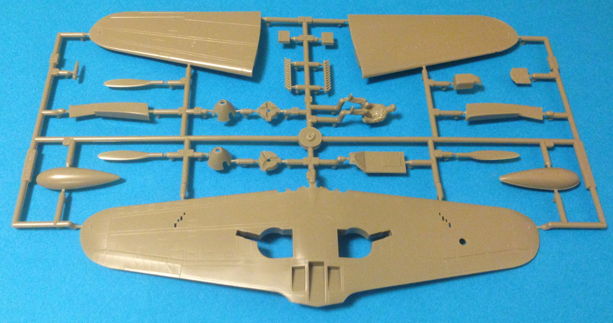 The quality of the molding is very good. The ailerons, tail planes and rudder have subtle fabric detail. The panel lines are of consistent width. You have your choice of weighted or unweighted tires which are molded in halves. There's a pilot figure included and he looks pretty good! The clear parts include the canopy, right and left cockpit doors, lower port wing landing light, head armor and the gun sight. The comprehensive decal sheet includes markings for 5 aircraft: