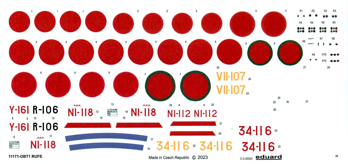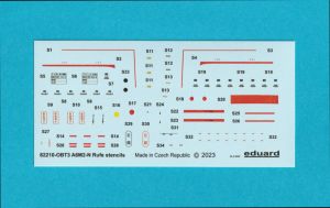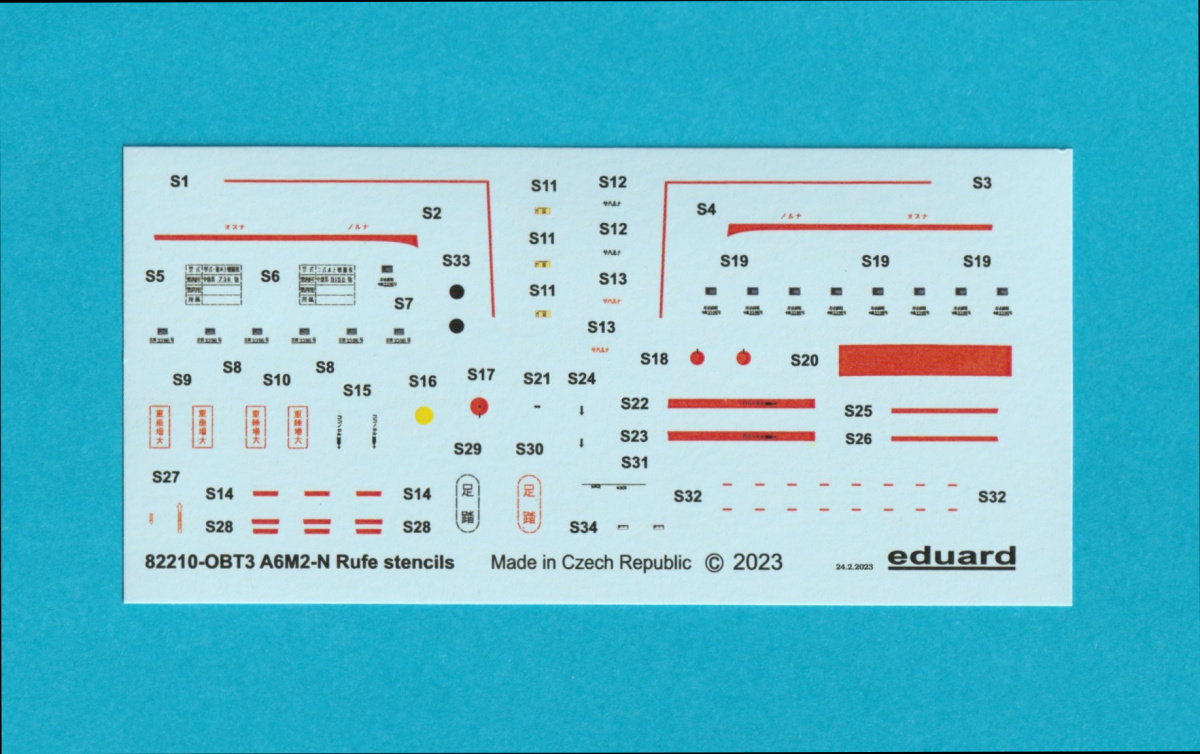 The decals are very well printed, in register and with accurate colors. There are 2 separate sheets of stencils. The instructions are well illustrated and include a parts map, a stencil placement guide and color callouts for GSI Creos (Gunze) Aqueous and Mr. Color paints.