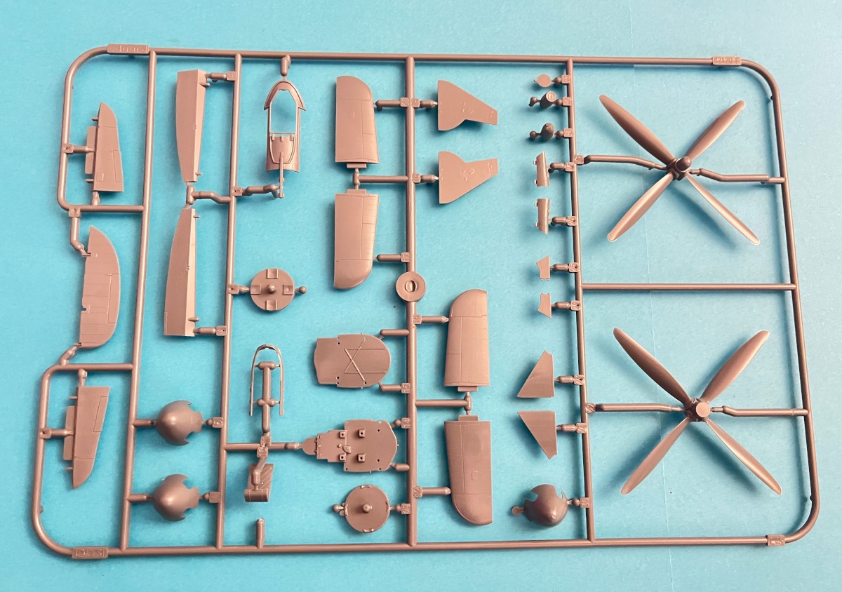 The control surfaces are separately molded and the fabric rudder looks great. You have 2 propellers to choose from. Underwing stores include drop tanks and rockets.