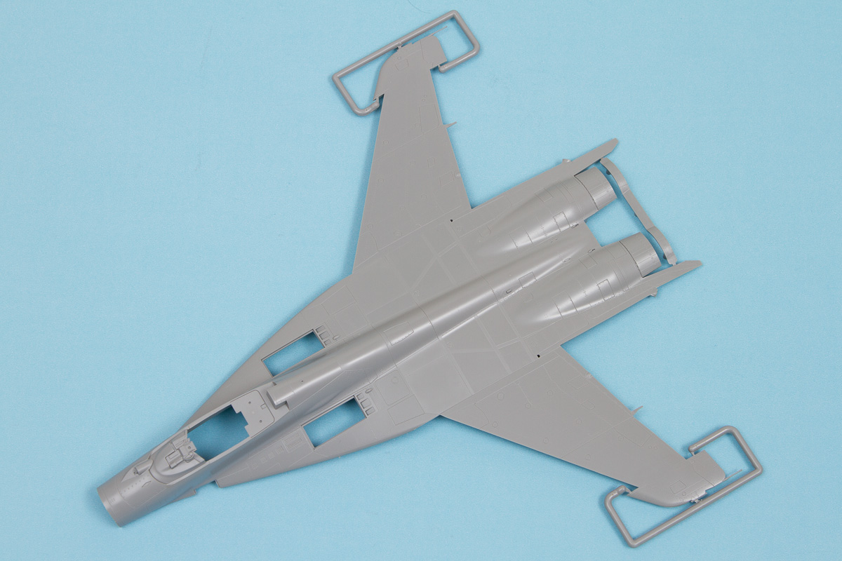 Moving on to the other interior bits, the wheel wells are made up from multiple pieces as well, again to ensure sharp details throughout. You'll also have to open up some flashed over holes in the wings and fuselage centerline if you want to add pylons. With that sorted out, add the cockpit and you can get the top and bottom pieces together. These incorporate the wings, but the flaps, ailerons, and slats are all separate. Similarly, the rudders are separate for the vertical fins, and the stabilizers can also be positioned any way you want to.