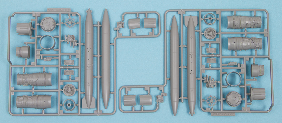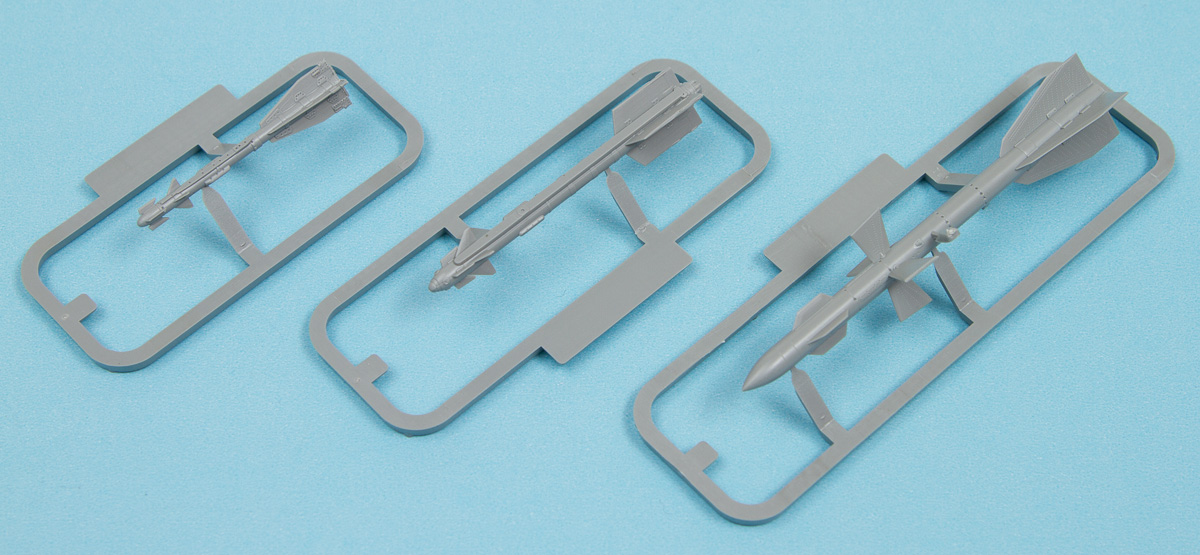 For stores, you get three types of missiles and two types of fuel tanks. There is a centerline drop tank and two wing drop tanks, two R-60 missiles, two R-73 missiles, and two R-27R missiles. The drop tanks are molded in halves, while the missiles are molded as single pieces. The latter is truly remarkable and has to be seen to appreciate. The engineering is superb, taking full advantage of slide mold technology to not only give all the fins beautiful detail, but give the sensor heads and rocket engines detail and depth. The pylons are also nicely detailed, and it would be a travesty to not load your MiG-29 up with a full complement.