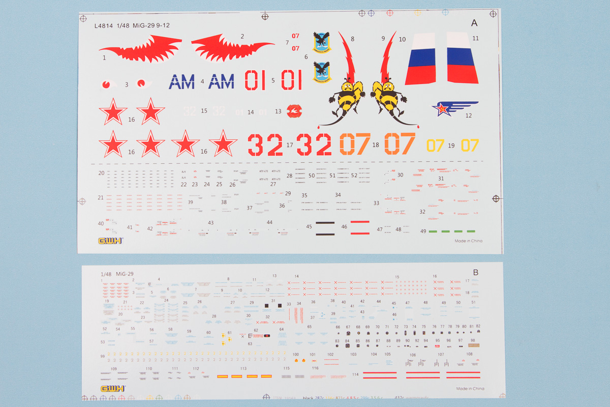 For markings, the kit comes with three schemes, all Russian and all finished in the two-tone gray camouflage scheme. The first is Red 32 from the 960th FR in 1997. This plane has the white, blue and red rudder and a unit emblem on the nose. The second one is Red 07 from the 968th FR at Altenburg airfield in East Germany in 1990. This plane is more simply marked, with just the number on the intake and tail and the Mikoyan flash on the nose. Finally we come to the most colorful on the sheet, Red 01 from the 1521st FR of the Soviet "Top Gun" program. This plane has a sharkmouth on the nose and a large bumblebee on the tail. In addition to the aircraft markings, the decals include comprehensive stencils for both the aircraft and the weaponry, adding another level of realism to the finished model.
