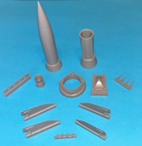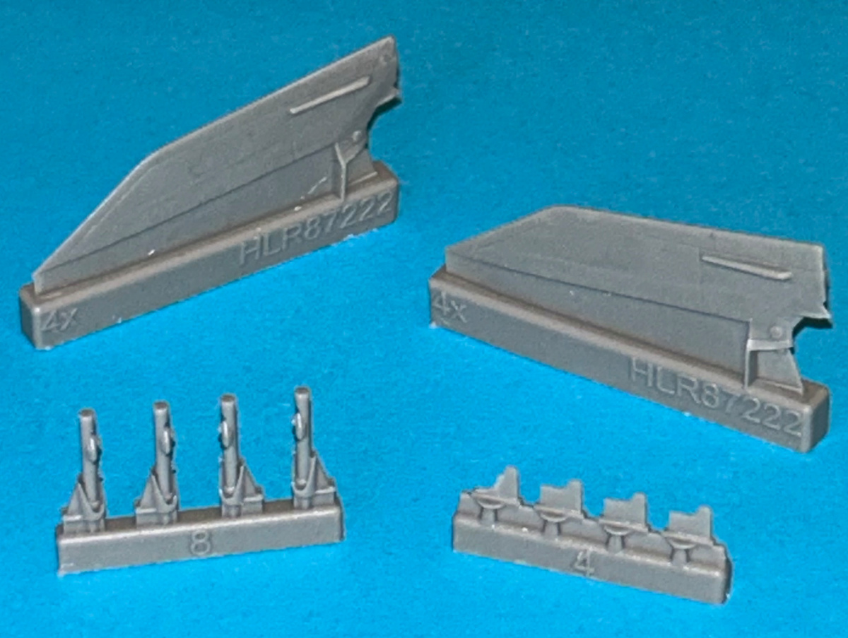The photo etch parts include handles, etc. Hauler's instructions are well illustrated with a logical build sequence. The color choices are simple: overall Dark Green (RLM 70 or 71?) with a "European Yellow" launchpad, or a Dark Green upper with a white lower end with black stripes and black/white fins.