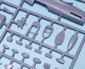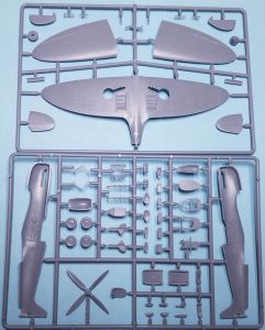 Each Kovozávody Prostějov (KP) 1/72 Spitfire PR Mk.X or PR Mk.XI kit contains the same two sprue of gray, injected plastic which contains 64 pieces total. Each kit also comes with a clear injected one-piece canopy, and this is the only part that differs between the two PR versions.