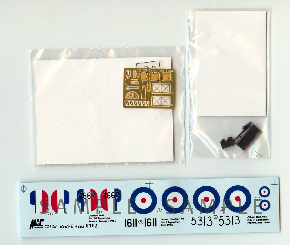 The MAC Distribution kit of The Bristol Scout follows the same lines set by this brand for all his WW1 aircraft kit offers: a couple of well molded, flash free, injected sprues complemented by a small PE fret, a small acetate sheet for the windshield and instruments, and a very nice resin Lewis machine gun. Completing the box contents are the necessary instruction sheet and the very well printed decal strip with all that is needed for the three options proposed, all of type C aircraft, and all of illustrious names: Canadian Ace Gordon Bell, and British VC holders Lanoe Hawker and Albert Ball.