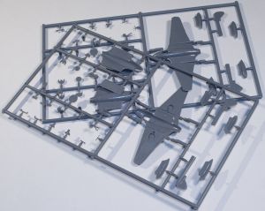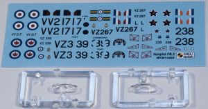 The Mark I 1/144 DH Vampire FB.5 consists of 31 pieces of gray plastic with a sprue of three, clear injected parts. Decals in this release are for four Vampires: