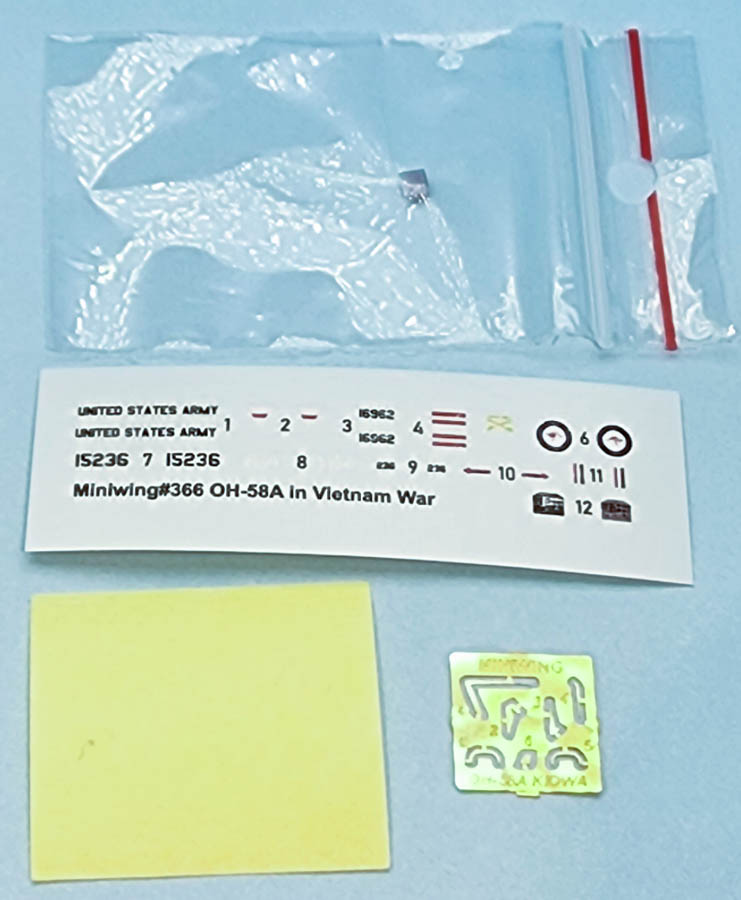 The Miniwing 1/144Â Bell OH-58A "KIOWA" consists of 22 pieces of gray, injected plastic and six pieces of clear injected plastic, consisting of the fuselage halves and separate doors if you choose to use them. Miniwing has been producing their new kits with clear fuselage halves, ensuring no gaps when fitting any clear pieces to "colored" injected plastic. Also included in the box is the instrument panel as a separate part (in its own baggie), a set of masks thankfully, a photoetch fret, and decals for the following two schemes: