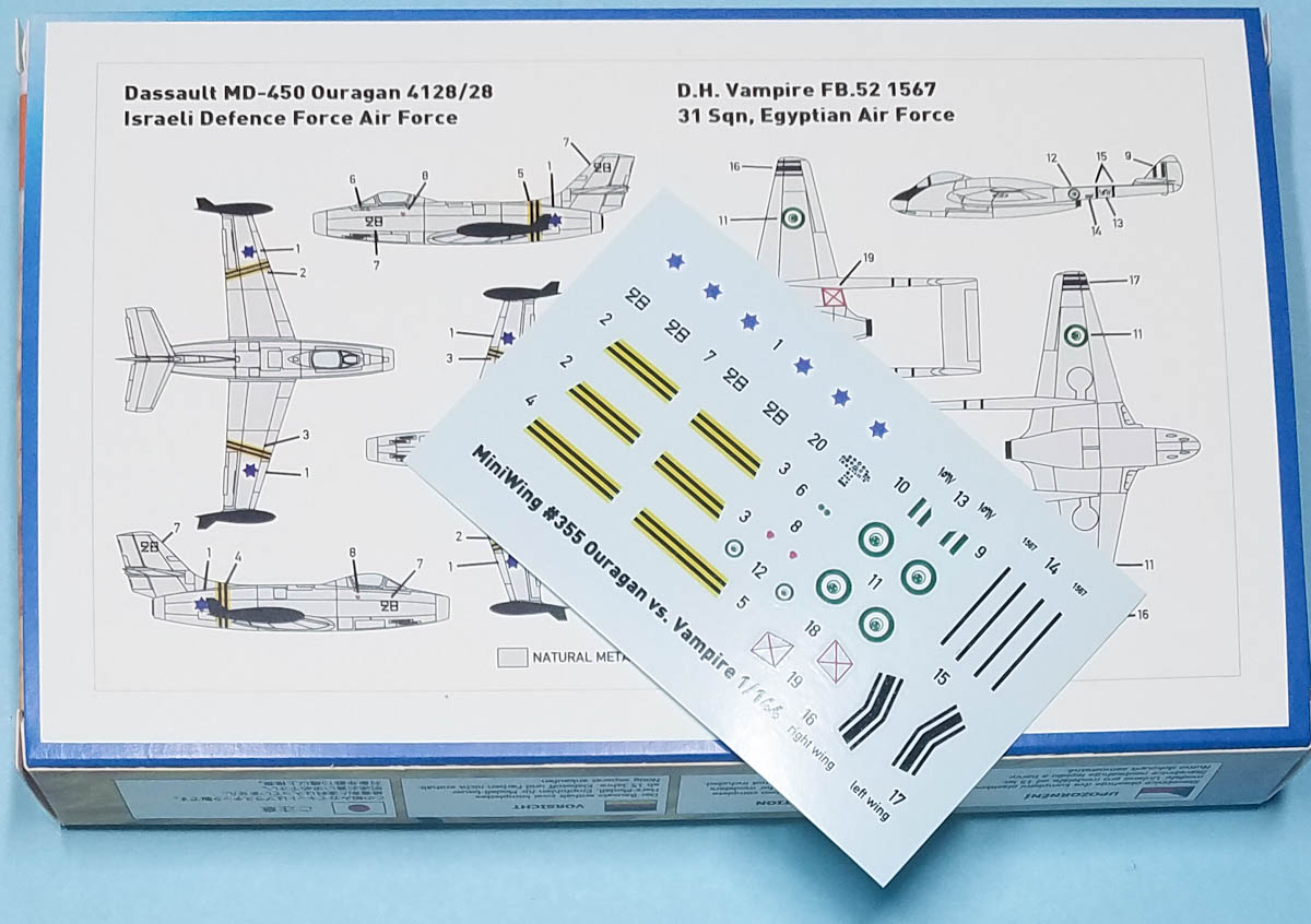 In a first for Miniwing, they have released what is called a 2-in-1 "Dogfight Series" release. This one couples an Israeli MD.450 Ouragan versus an Egyptian DH-100 Vampire. This consists of the Miniwing MD.450 Ouragan and the Mark I DH-100 Vampire FB.52.