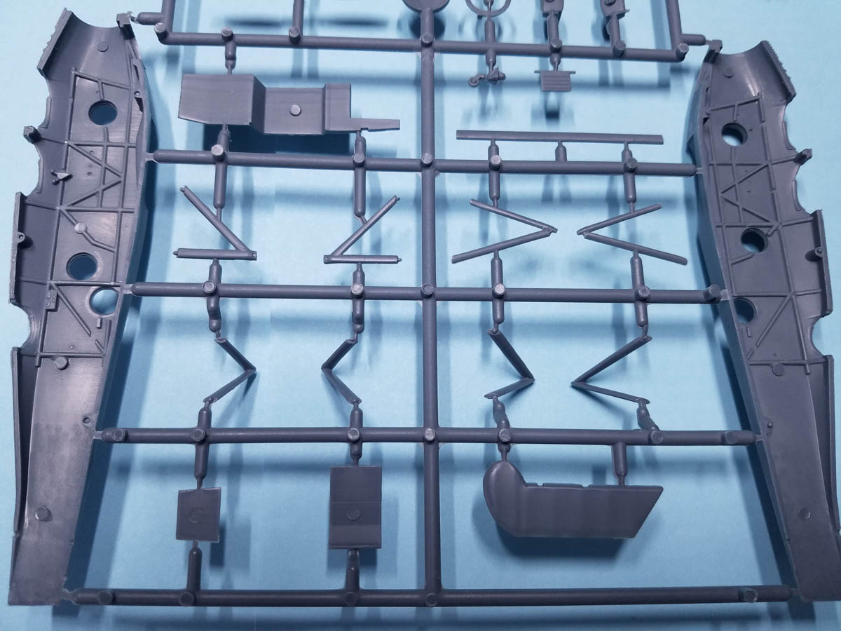 And out of the box it's a very nice cockpit. Not only is the tubular structure molded in to the fuselage halves, but also present as separate parts that sit between the halves. In addition there are two seats, two control wheels and two instrument panels. Also included is the rear gunner's seat and back rest plus flooring for all three stations. Injected clear plastic takes care of the windows in the fuselage sides. The only thing missing with this kit are seat belts so use the ones you think best. Now that the cockpit is finished fuselage halves can be joined.