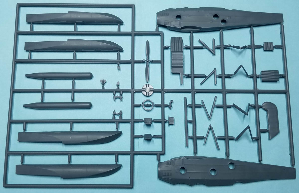 PlusModel has released two boxings of the Martin T4M in 1/72, a "wheel version" and a "float version". Each kit is identical in contents except for decals and instructions. That means you'll be left with wheels and landing gear if you're building the float version, and floats and their struts if building the wheeled version. Each consists of 94 picees of gray, injected plastic and a clear injected sprue with 11 pieces. Also included is an engine made out of 29 pieces of resin. For the "wheel version" decals are for four T4Ms: