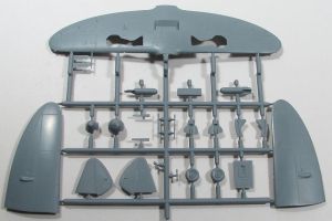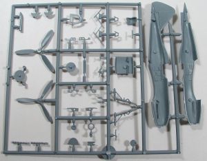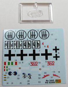 The RS Models 1/72 Reggiane Re 2005 consists of 58 pieces of dark gray injected plastic, one injected canopy (windscreen and sliding portion as one piece) and decals for 4 schemes: