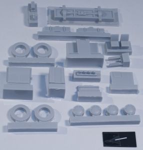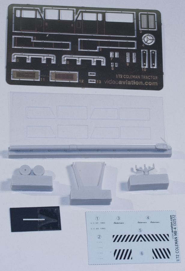 The videoaviation.com 1/72 Coleman MB-4 consists of 31 pieces of resin, a clear fret with eight windows on it and a photoetch fret with 19 pieces of brass on it. There is also a decal sheet consisting of just the basic markings: warning stripes, U.S. Air Force and Coleman text, and PSI information for all four tires.
