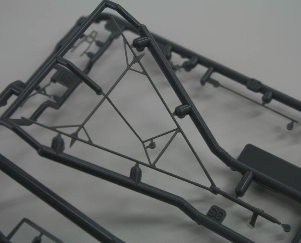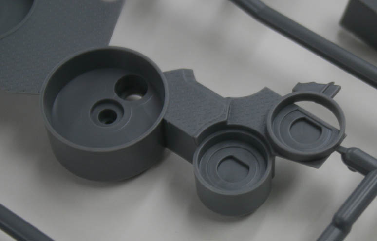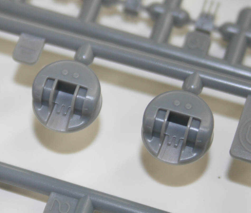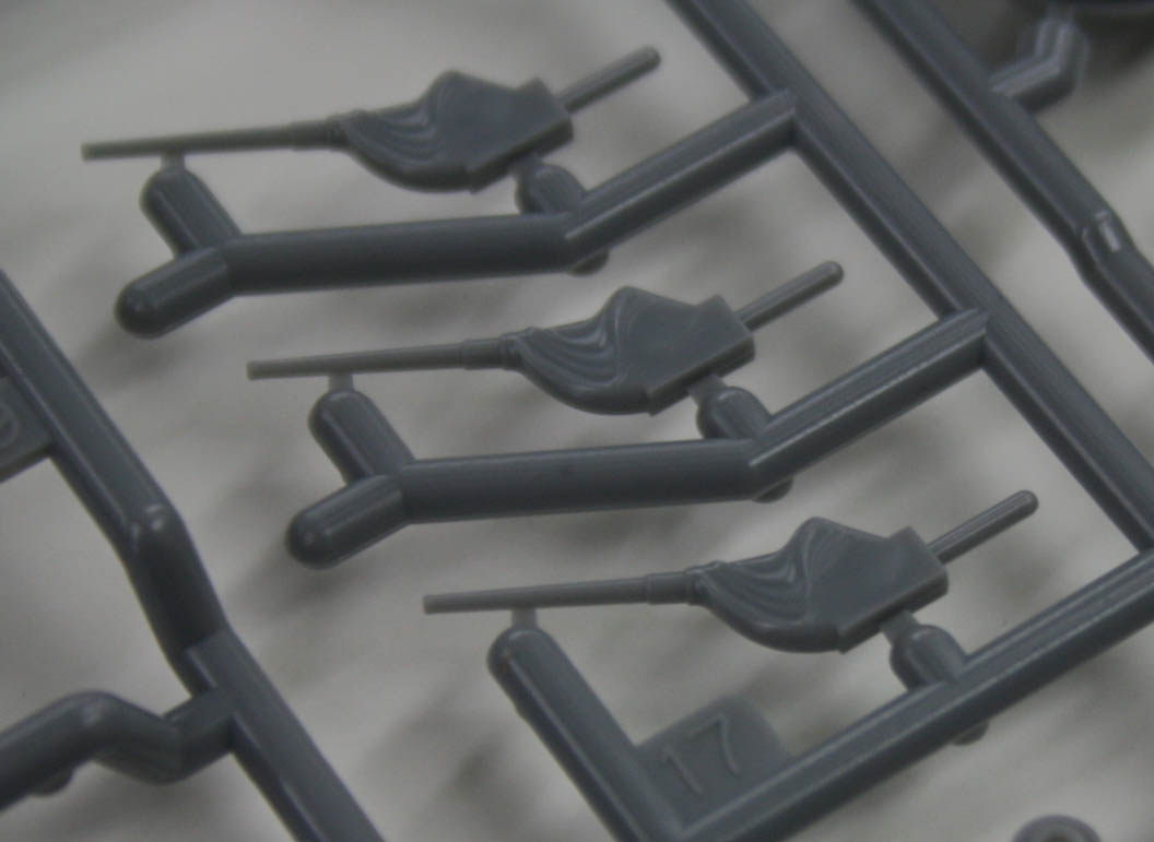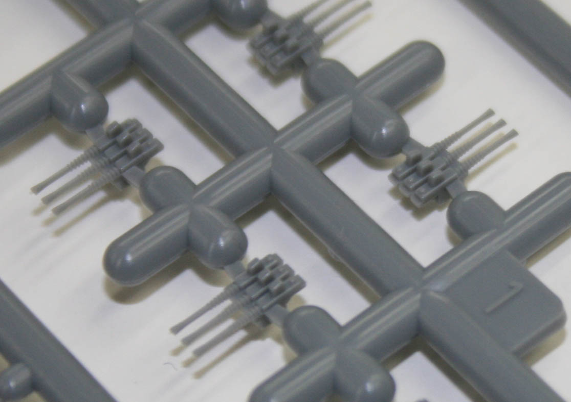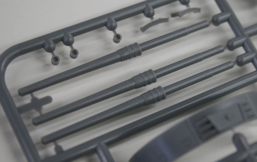 The guns themselves were the largest surprise to me in terms of detail. The long pieces behind the pivot were curious until I remembered the pieces for the breech block that fit around them, but then I noticed that the ends of the barrels were solid, unlike those of Dragon or Trumpeter. It turns out that this intial assesment is somewhat in error; Tamiya does give open barrel ends but either as separate pieces, or as a replacement metal barrel set. In the case of the plastic ends, they can be seen above the top barrel in the picture to the right.
