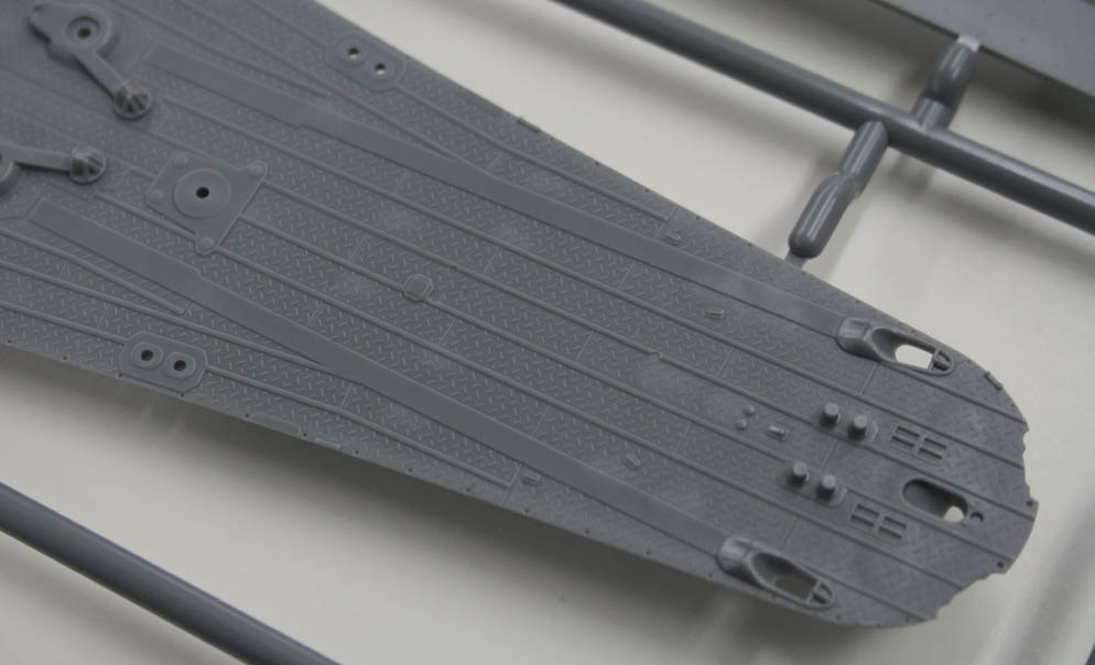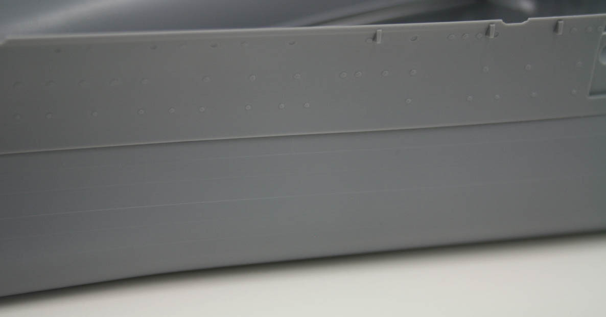 Starting with the hull. Many modelers have been clamoring for hull detail in way of the plating formed by the different strakes of steel. Various companies have tried and for the most part have come up lacking. Tamiya takes another crack at it with this release, presenting actual raised strakes instead of the simple engraved lines their Akagi used.