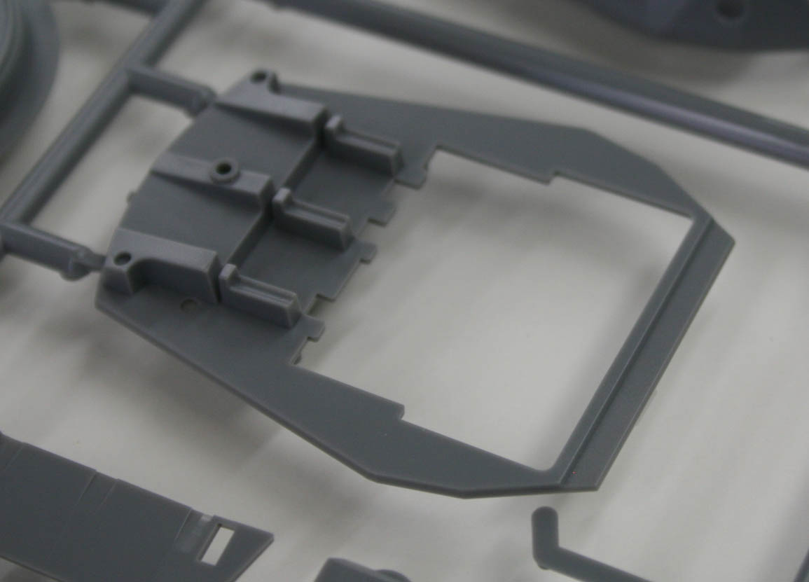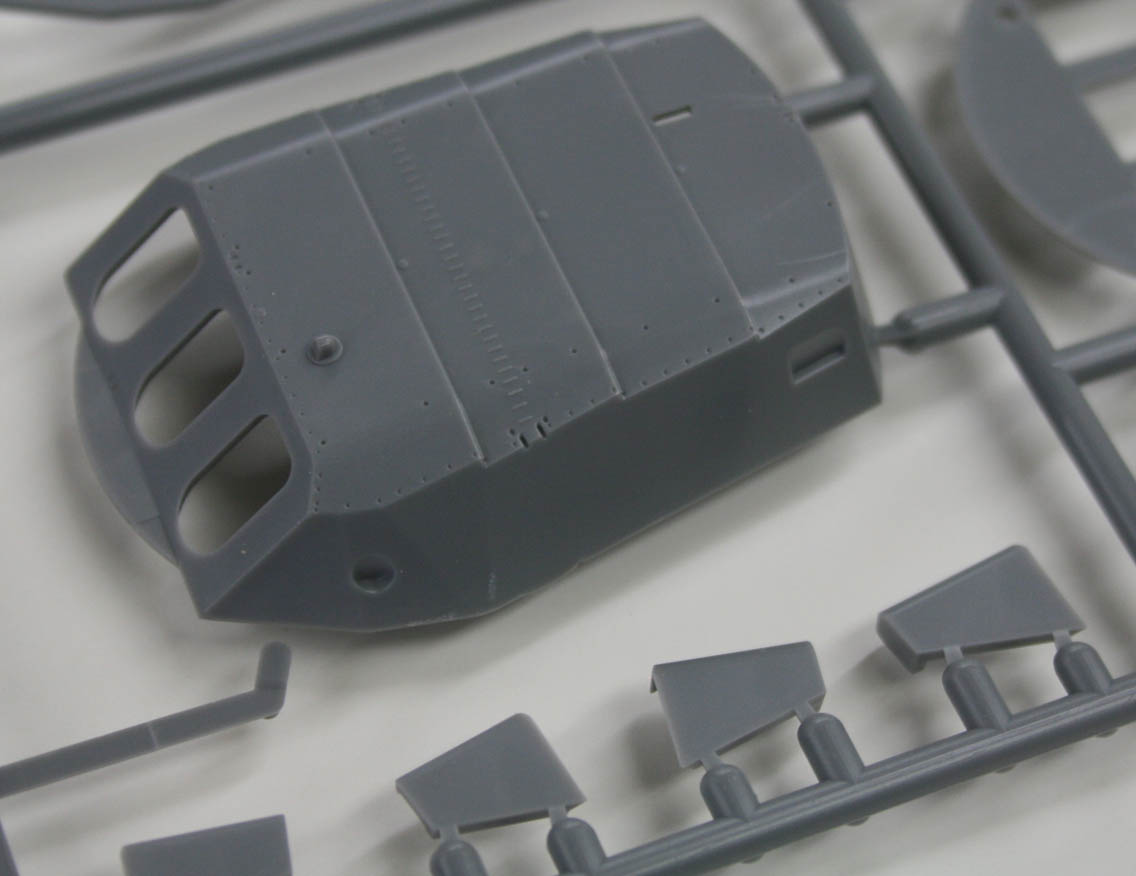 There are some draw-backs to the strake plating however. When this is combined with the need to have mulitple mold pieces, if the mold break-down and injection process isn't perfectly handled there will be seams that can be a pain to deal with. Does the modeler remove the seams, as well as all detail in the area, or leave the detail and by extension the seams? Or, does the builder take a stab at a more difficult proposition, removing the seam and then restoring the detail seamlessly (rimshot!)? This aft seam isĀ the one I worry about most; being long and cutting through several strakes across its length. The hull detail is fashioned by alternating raised pieces atop a smooth surface, so when the seam has a step in even the lower surface it means that more is going to need to be saneded away to get that lower surface smooth.