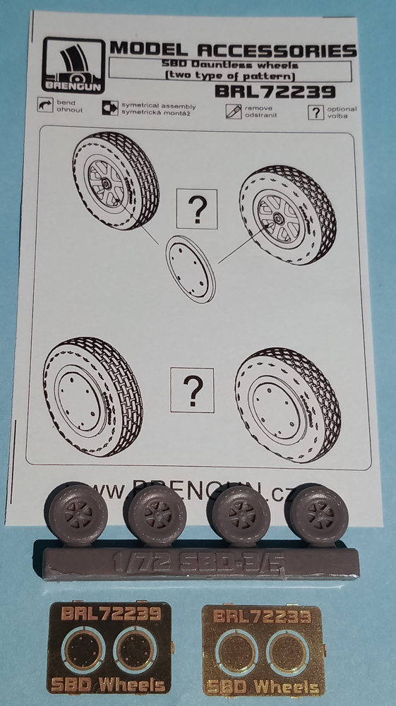The Brengun 1/72 SBD Dauntless Wheels consists of two wheels/tires along with photoetch wheel covers. Some of the Dauntlesses flew with covers over the wheels so Brengun has supplied these as photoetch pieces, two per wheel. Check your references to see if the Dauntless you're building had these covers.
