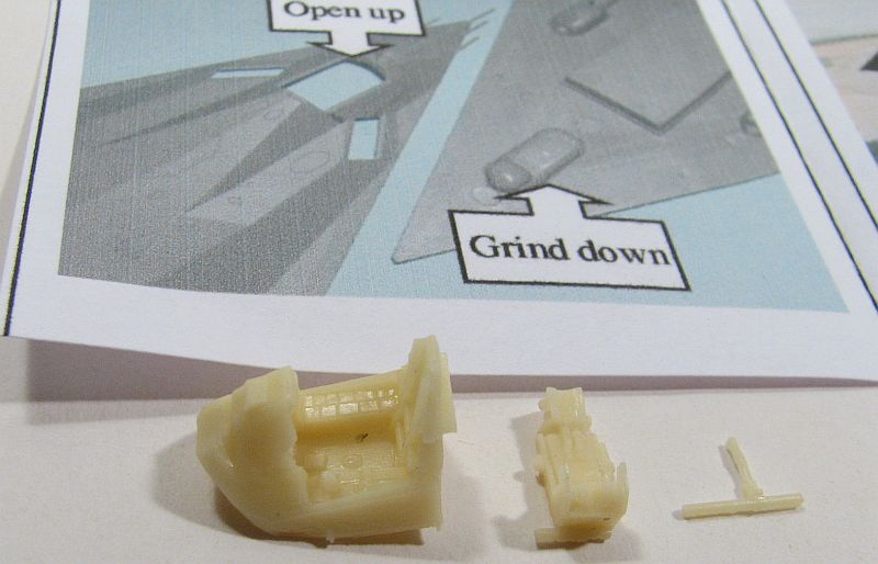 The RetroWings replacement resin cockpit for the F-117 consists of a cockpit tub, seat and control stick. There is some kit modifications needed, namely making the hole in the upper fuselage for the cockpit a little bigger, and sanding down the bulge on the inside of the lower wing that is the nose gear well. Be careful with this, though, so you don't punch through the floor of the landing gear well.