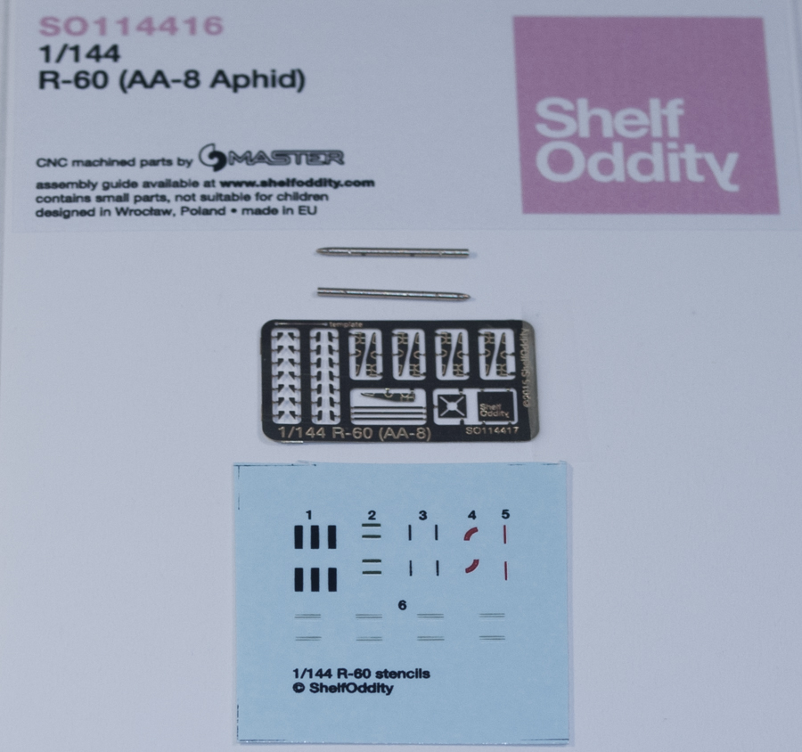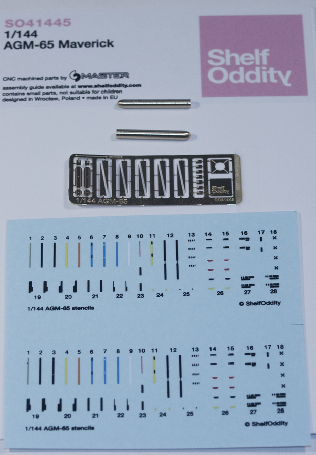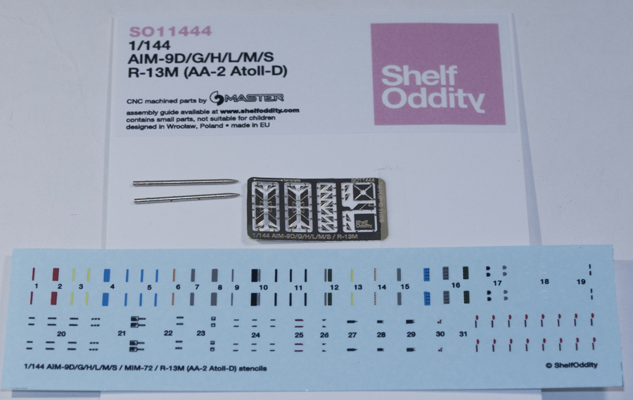 Shelf Oddity is a recently new company out of Poland. They realized there was a need for 1/144 ordnance and so with help from Master have created ordnance for 1/144 aircraft models. While a necessity in 1/144, these are not for the feignt of heart. Each set comes with two "bodies", a photoetch fret and decals.