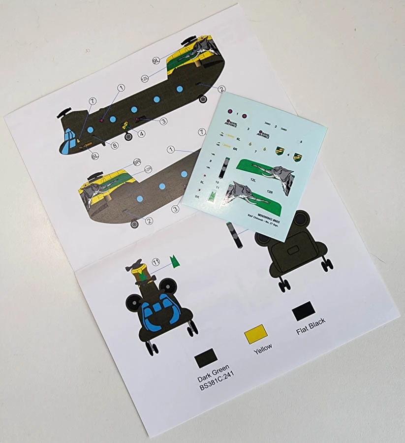 Recently, Miniwing has started to release single decal subjects to cover a specific subject. One of their first is for the Revell 1/144 Boeing Chinook, with these markings for an HC.4 from No. 27 Squadron. This specific helo's markings were added in 2015 for the squadron's 100th anniversary. It's a very colorful addition to an otherwise "dull", overall olive drab green aircraft. I for one will be tracking down a Revell kit just to model this specific helicopter.