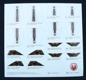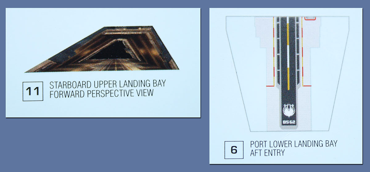 Unlike the Galactica the hangar pods have interior baffles that prevent you from seeing all of the way through them. Decals are provided to give the illusion that you can and should prove adequate. The baffles hide a series of posts that are used to attach the upper hangar pod to the lower so removing the baffles and the posts could prove to be a little tricky. Decals are also provided for the runway section of the pods.