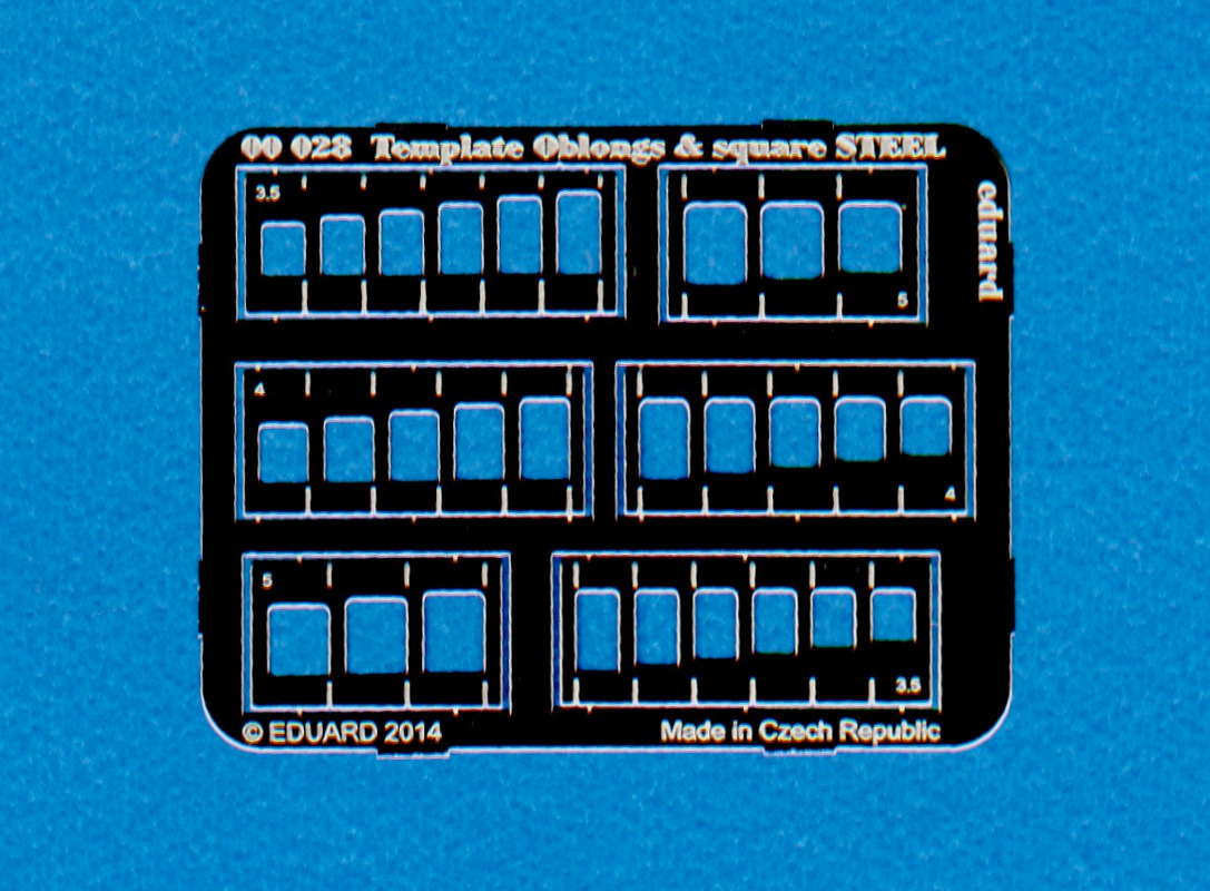 This new set of scribing templates (item number 00028) is for "oblongs" or rectangles, if you will. It is a smaller set than 00029. There are 6 different rectangle sizes which are measured by width, ranging from 3.5 to 5 millimeters. Each rectangle has a minimum of 3 different sized rectangles for scribing. They are attached to a common fret but each template can be individually removed, which is useful if you need to scribe on a curved surface like an airplane fuselage.