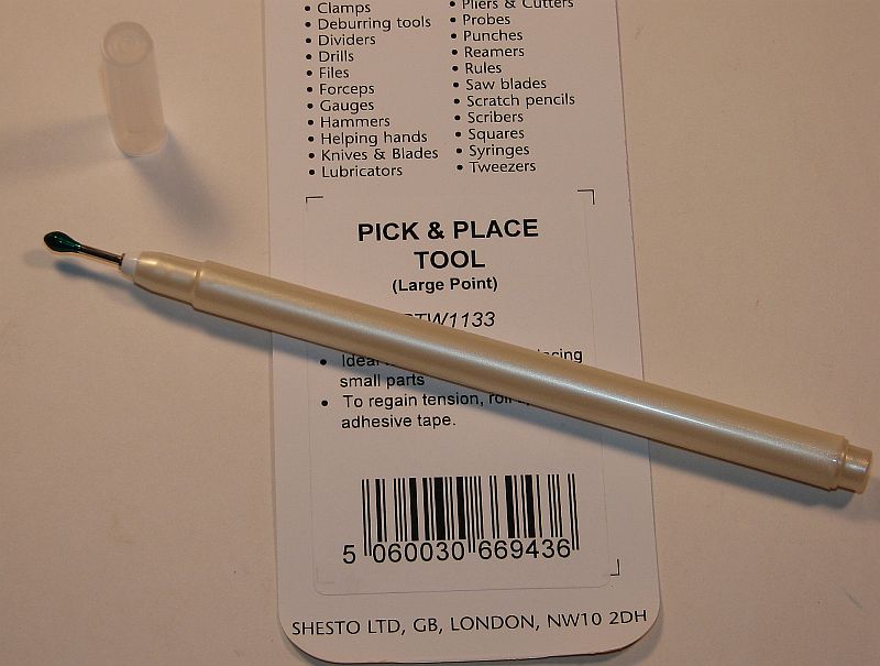 The large Pick and Place Tool from Model Craft can be used to place parts into place. The premise of the tool is simple - it appears to have a head with some sort of a mild, "sticky" agent to which a part is placed. When the part is placed against glue where it's supposed to go, the adhesive has enough friction to take the part off the Tool.