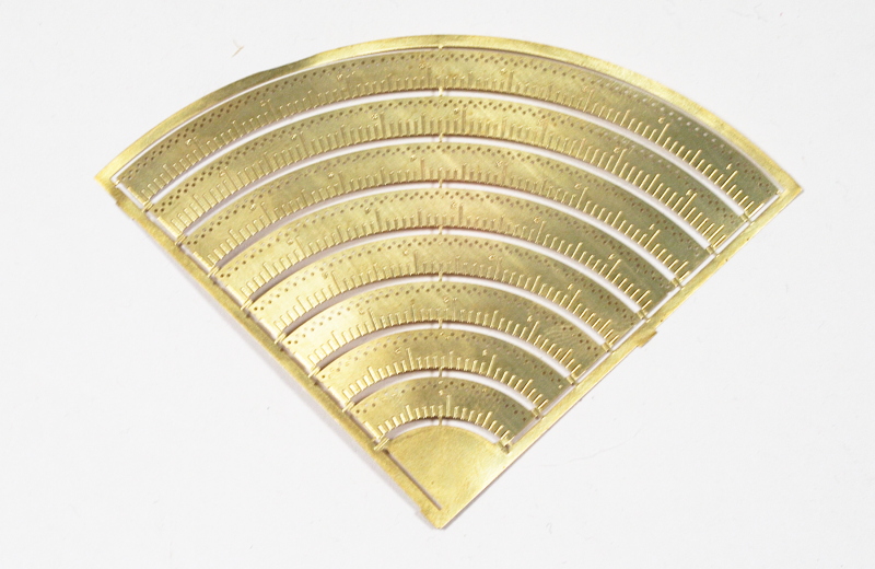 The next tool from PK is their "curves tool". While in my photo I still have all curves attached to the "gate", each curve can be removed to make it easier to work with separately. Not only will this help for scribing curved panel lines in your model, it can also be used again, to help cut curves out of masking material. However, the advantages just don't stop there. What appear to be round "indentations" at the top of each curve are actually holes, the obvious application to add rivets to a model in a precise arc. In addition, each curve is marked in millimeters, the actual length being determined by the size of the curve.