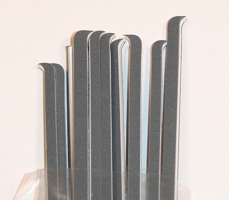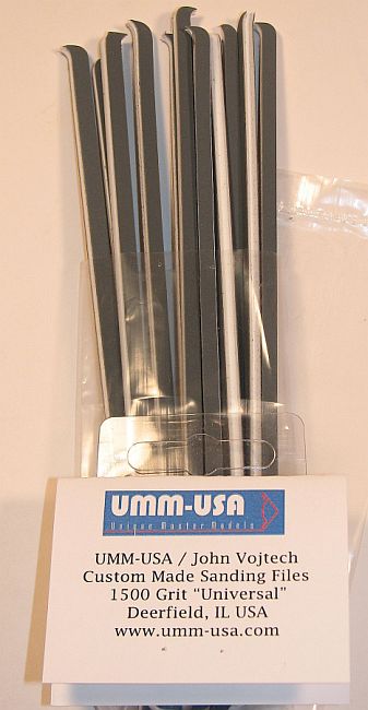 UMM-USA sends us two sets of their new Custom Made Sanding Files "Universal", 800 and 1500 grits. Not only is the width of these unique - they're thinner than other sanding files out there - but the tips of each file also is unique. They have a unique shape that should help to get into some of the tightest places. Pretty awesome, especially when you need to sand that out-of-the-way place that you can't reach with your "regular" sanding sticks, or with files.