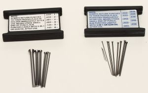 Priced significantly less than the entire punch set, these replacement sets provide just the punches, in both the regular and the subminiature sets. The regular set contains six punches (.039, .059, .081, .089, .120, and .160), while the subminiature set contains ten punches (.018, .023, .028, .033, .038, .043, .048, .053, .058, and .063). Priced at $22.50 and $42, respectively, these replacement punch sets are less than half the price of the full punch set, so they feature a large savings should you need to replace a punch.