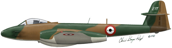 Meteor F.8 412 Syrian Air Force, 1956 Another foreign user of the Meteor was Syria, who flew F.8s during the Suez Crisis of 1956. Camouflaged in brown and green over a light gray, the Syrian Meteors even managed to see action during the conflict, with an RAF PR Canberra being shot down by a Syrian Meteor on November 6, 1956. Sources Meteor In Action, by Glenn Ashley, Squadron Signal Publications Wings Over Suez, Brian Cull, Grub Street Press Fighting Colours - RAF Fighter Camouflage & Markings 1937-1975, by M J F Bowyer 1975, Patrick Stephens, LTD. |                  Air Intelligence 1998 Modelers' Reference Guides 1/48 Scale Guide $20.00 1/72 Scale Guide $25.00 HH-43 Huskie Color Reference Guide $15.00 Please add $3.00 Postage in the US. TacAir Publications PO Box 90933 Albuquerque NM 87199-0933 USA E-Mail Us! | |