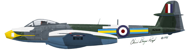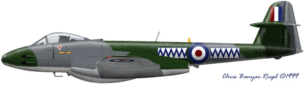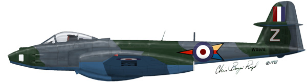 The Gloster Meteor F.8/FR.9 Part 2: Camouflage |  | The Meteor didn't spend all of its time in a shiny silver finish, though. Camouflage is essential to survival in a combat situation, and the Meteor wore camouflage from day one. But if camouflage is so essential, why did the British put such large and colorful squadron markings on their planes? Ah, well, no matter, as it gives us something neat to build models of!  Meteor F.8 VZ467 "Winston" This is an interesting Meteor example with a long and varied history. It has the distinction of being the last flying Meteor F.8, and is painted up to represent 615 (County of Surrey) Squadron RAuxAF. It was supposed to partake in a flypast celebrating Winston Churchill's birthday at some point in the 1970s, but because of the fuel crisis the flypast never took place. For a more detailed history, check out the article on the Czech Master Resin 1/72 Meteor F.8 by Damien Burke.  Meteor FR.9 WX978 'Z' No. 8 Squadron Middle East, 1959 A weathered example of the Meteor FR.9, this plane shows off the blue undersurfaces carried by the FR Meteors. The unit flash consisted of a chevron divided horizontally with sand, red, and blue bands. The white "Z" on the tail is outlined in red.  Meteor FR.9 XZ608 No. 208 Squadron Aden, 1956