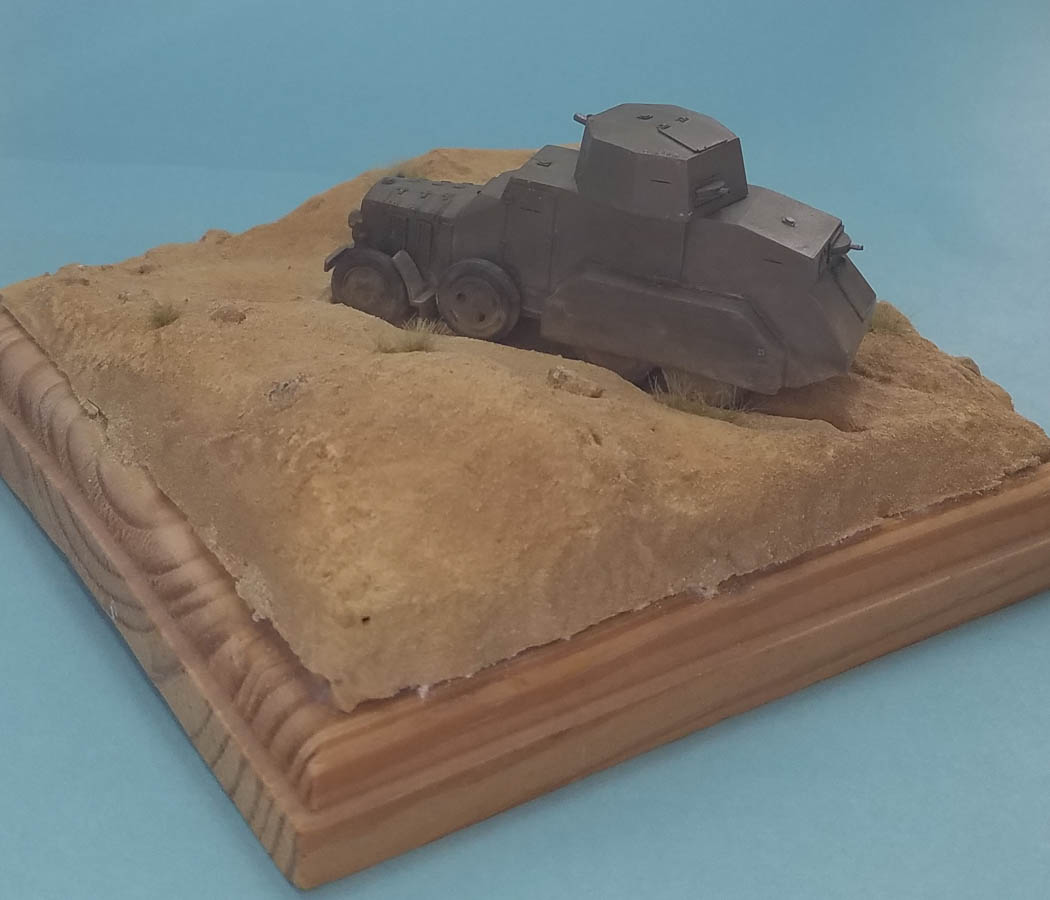 The base is a pine one found at a local craft store - very inexpensively - sanded, then structure was added with carboard. Once I had that to the level (literally) I liked, Celluclay was then applied for texture and small pebbles found in the road were inserted into the wet Celluclay "here and there". Once that was dry , I used the same Tamiya Diorama Texture Paint, Grit Effect, Light Sand paint that I used on the Terni base. All you do is brush it on your base like any old paint, and since it has "grit" in the paint itself, it really doos look like sand. Brilliant!