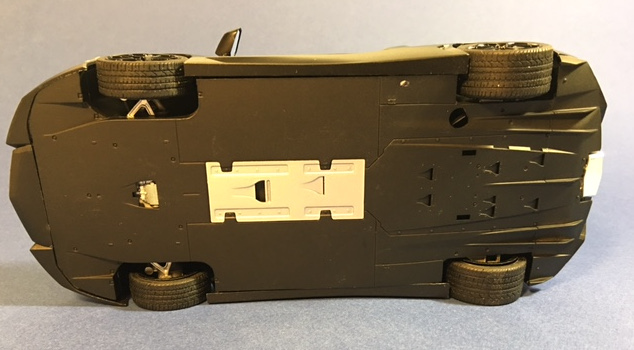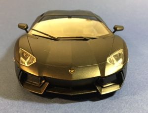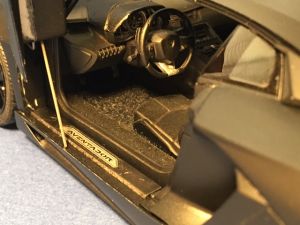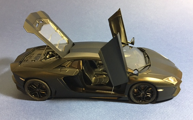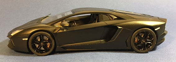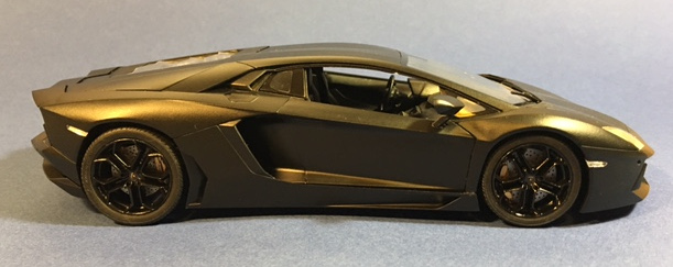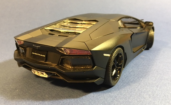 I wanted to make an Aventador SV to display, but no one makes an injection molded kit of it. The closest thing I could find was a transkit from C1 Models, which I purchased. However, I did shy away from it during the build. I have had some bad luck with resin parts before, and I read that Aoshima had released a Aventador SV. I decided to go with a Tamiya TS-29 Semi-gloss black for the body. The car needed 2 paint jobs actually. I began to polish the roof after priming and painting. When doing so, it revealed a little too much shine for my liking. So, I roughed up the paint a bit and I resprayed it. I decided to leave the paint as it was, without polishing it. I was lucky enough to put down a good coat of primer, which yielded smooth paint coats. So, I left it alone. The car has the look I want, which is almost a full matte finish. If you look closely you can see a little texture, but I was okay with that.
