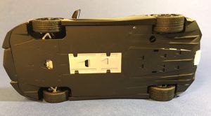 The body of the kit comes heavily reinforced by Aoshima (see pics in the First Look article). It is easy to mar or tweak the body panels, so be careful when removing them from the sprues. Also, when the reinforcing plastic is removed, the body becomes extremely fragile and the A-pillar and the bottom of the body can bend easily. As you continue assembly you have to glue more pieces to the body, which will help strengthen it.