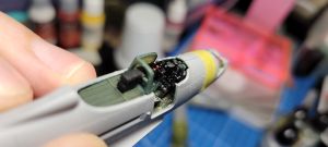 The Arma decals are excellent and go on with no fuss at all. The Italian option is a P-39Q-15 from 10° Gruppo, 4° Stormo based at Galatina Air Base in Italy in November of 1944. It has the Italian roundels in six positions, a unit emblem on the tail, serial number under the stabilizer, and small individual aircraft numbers on the tail and forward fuselage. Overall a pretty minimalist scheme, and the Italian-specific decals went on pretty fast. Then came the real challenge: the stenciling. Challenging only because there’s so many of them. Applying them went fine, but several breaks were needed because, as I said, there’s so many of them and remember, this is 1/72. Squinting at tiny decals of text takes a toll, believe me. But in the end the result is well worth it, and after another clear coat to protect them, I could turn to the final steps.