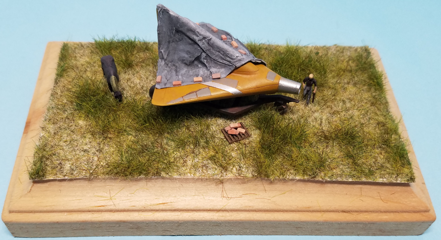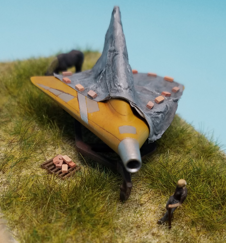As I mentioned above when I sanded the fuselages to meet the canopies, one came out worst than the other. The one "not so bad" was the basis of the Luft '46 bird but the one not as good I needed to come up with something. That's when I thought about covering the model in a tarp, and a friend mentioned how about being "discovered" in a field. Perfect! The thinking was the Lippisch would have been left "au natural" so I sprayed this one mainly in a wood color, adding some "grain" via various means of drybrushing and washes. Once the wood areas were taken care of then some parts were masked off and Vallejo Aluminum was sprayed. I also wanted to show other metal areas differently so those were hand-brushed using Vallejo RLM 02. Now how to create the tarp.