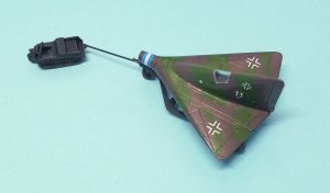 I knew I wanted to actually finish one of the Lippisch with the markings supplied in the box, so I chose what I thought was the easiest - the first scheme - and went from there. The rest of the paints used with this model were all Hataka. Even though Hataka says their Red Line paints are meant to be sprayed out-of-the-bottle, I still thin them even more. First mainly with Future, but also with a few drops of their thinner. The underside was sprayed with Hataka's RLM 76 while the uppers were sprayed with their RLM 81 and RLM 82, masked with some tape but mostly BlueTack. Once the painting was finished then it was overcoated with Future, even though all the paints had Future in their mix.
