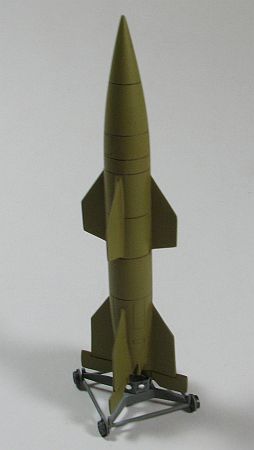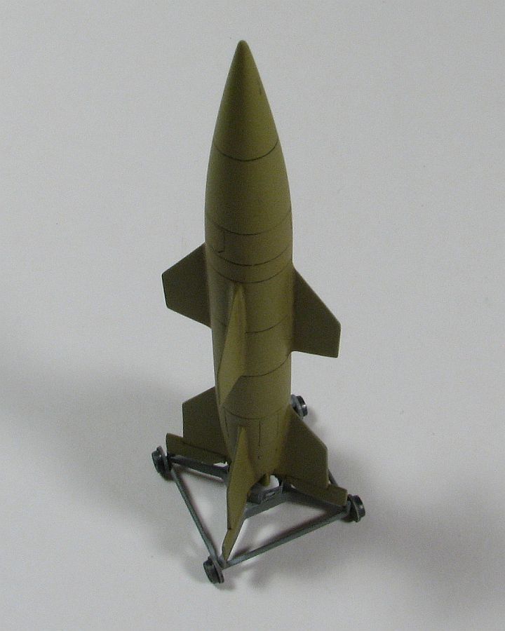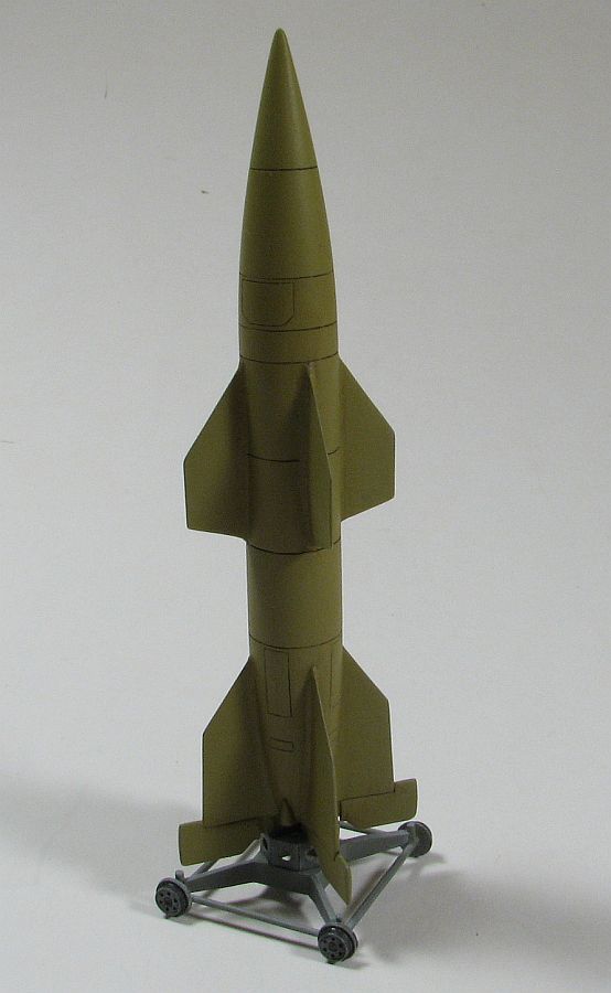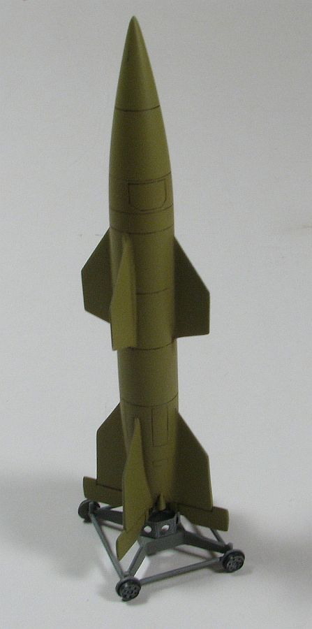 There are four schemes represented on the kit bottom this missile can be finished in. While I think three of them are "what-if" schemes, I can't be sure but the "black and white" scheme is probably what the prototypes were finished in. In any event, I decided to go with the Dunkelgelb scheme just because I had the Vallejo paint available for it. I sprayed the missile with it, and the "launch base" with Aeromaster's (actually Vallejo) acrylic. The panel lines were picked out with an oil wash of Van Dyke Brown while the "launch base" received a dary gray wash, and a light gray, oil dry brush. Once that was all dried, I sprayed both missile and base (after gluing together) with Xtracrylix Flat, and finished it all by applying a graphite rub to the wheels (to give it a worn, metallic sheen without being too bright).