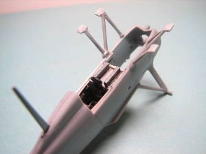 | There are a few things that need to be done prior to working the Starfighter cockpit into the Monogram kit. The sides of the fuselage halves need to be sanded smooth - including the "hole" for the pilot's "peg" - and the faux-instrument panel molded into the upper fuselage piece (Monogram part number 4) needs to be removed as well. There are also some things that need to be accomplished with the resin pieces. | |