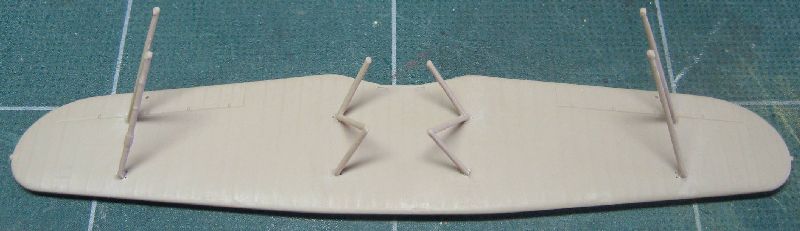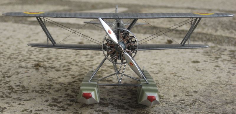 It is time now to add the rigging. For this plane, I use 0.11mm thick fishing line. First, I glue a wire in the hole previously drilled in the lower wing, then I tighten it through the hole in the upper wing. When the glue is competely dry, I remove the excess of wire, sand the upper surface of the upper wing and the final paint session can be done.