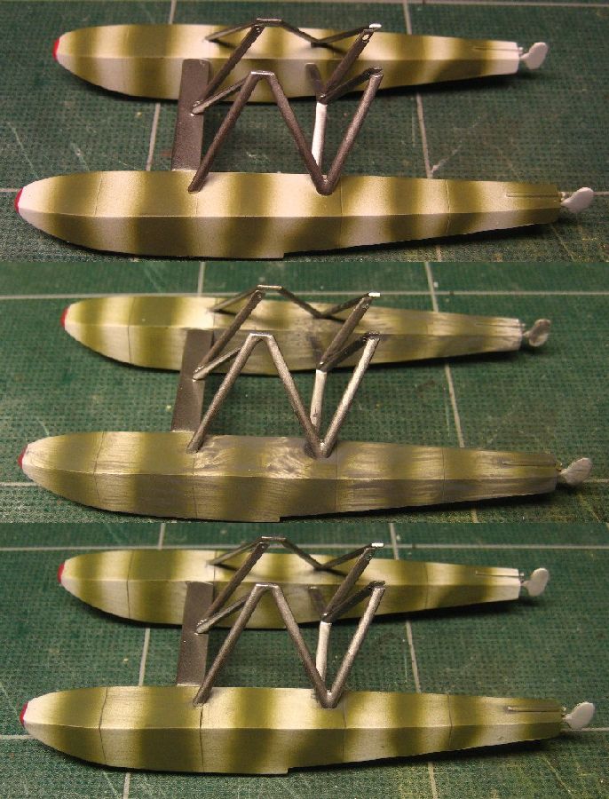 I used Pro-Modeller weathering wash to add some highlight of the floats. First step without wash, second step fully covered with the mixture and then, the third step after removing the excess.