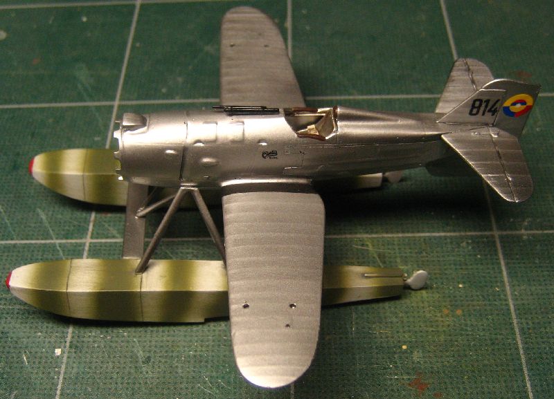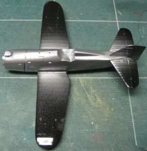 First of all, I sprayed a coat of Alclad gloss black, it is supposed to give a better finish with metallic paints. Maybe I sprayed too much of this paint, at the end, a lot of the plane's details were diminished. Next time, I will proceed differently.