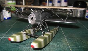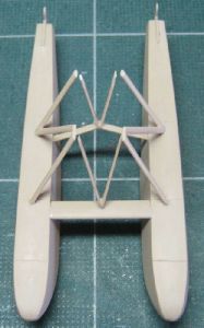 The float assembly requires some attention to place correctly the various struts. To help to attach this assembly, I drilled some holes in those struts and added some steel wires under the fuselage. Lots of tries were necessary to have a correct fitting.