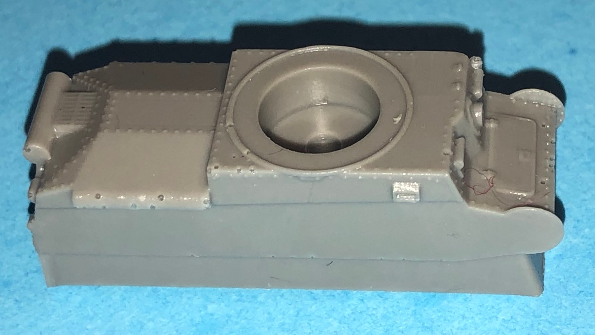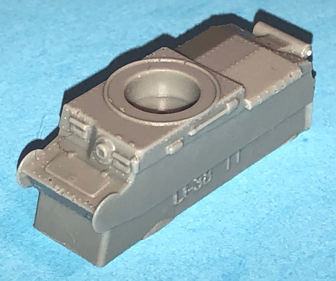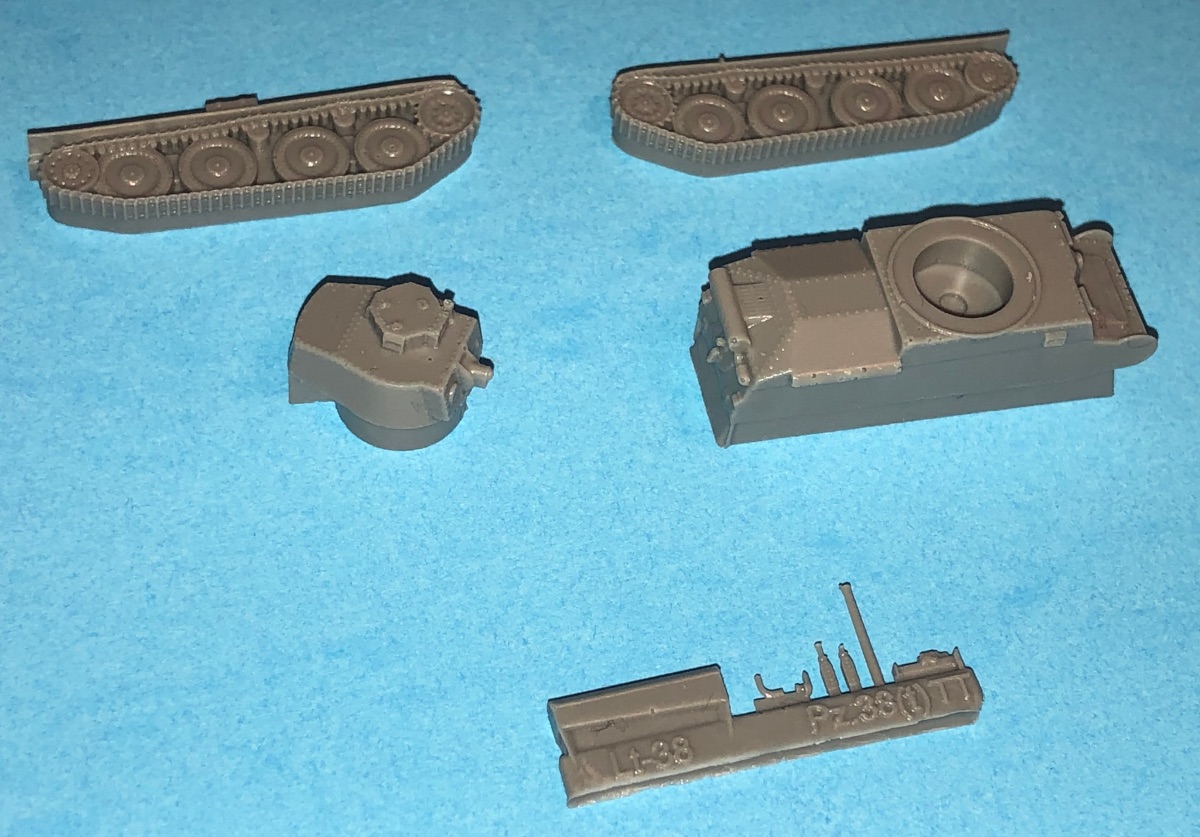 This is Hauler's 1/120th scale Panzerkampfwagen 38(t) ausf. The kit consists of 10 finely cast pieces- a 1 piece hull, 2 sets of tracks with integrally molded wheels, turret, jack, Notek light, the main gun, etc. The tiny rivets on the main hull have to be seen to be believed. The wheels and tracks are also highly detailed. ALL of the parts are highly detailed.
