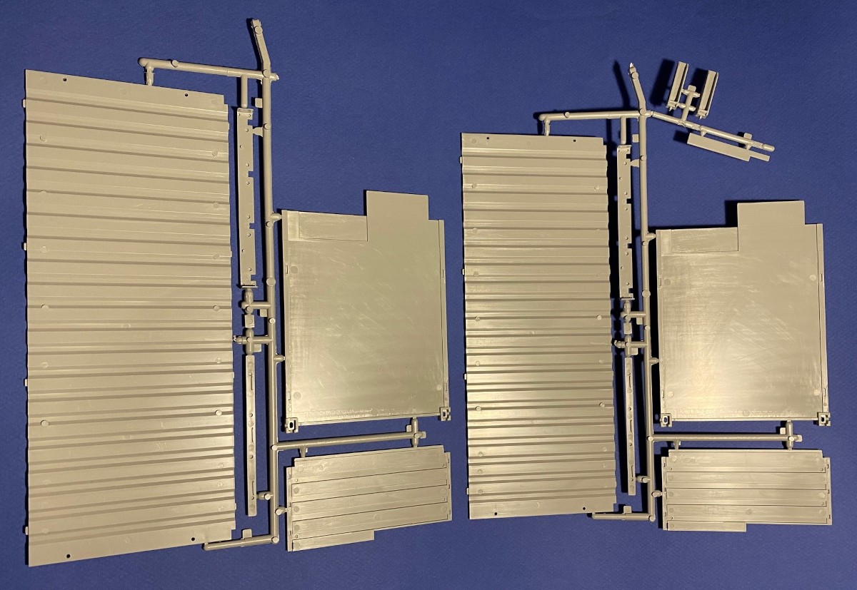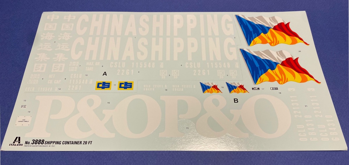 The kit is molded in gray plastic. I was surprised to see how thick the pieces are, which has the added benefit of not having any warping issues. The bottom of the container is two separate pieces that join together. The side panels and roof are all single pieces. The doors and handles, latches and hinges all have great detail. The corrugated look to the container is also well represented. The doors can be posed open or closed. The decal sheet is a big feature of this kit. Massive decals which represent 2 major shipping companies fill the sheet. The instructions are very basic but it almost makes sense, because a container is simply a big box, but they will be easy enough to follow for assembly.