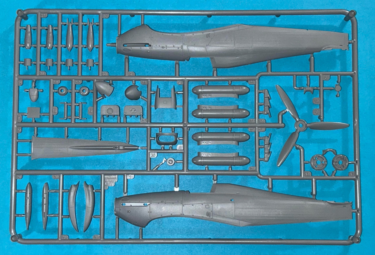 The radiator is equally well detailed. You also get 2 different tail wheels and spinners to choose from. The control surfaces are separately molded and the fabric rudder looks great.. Underwing stores include drop tanks, bombs and racks. The kit also includes a set of rice paper masks for wheels, canopy and windscreen.