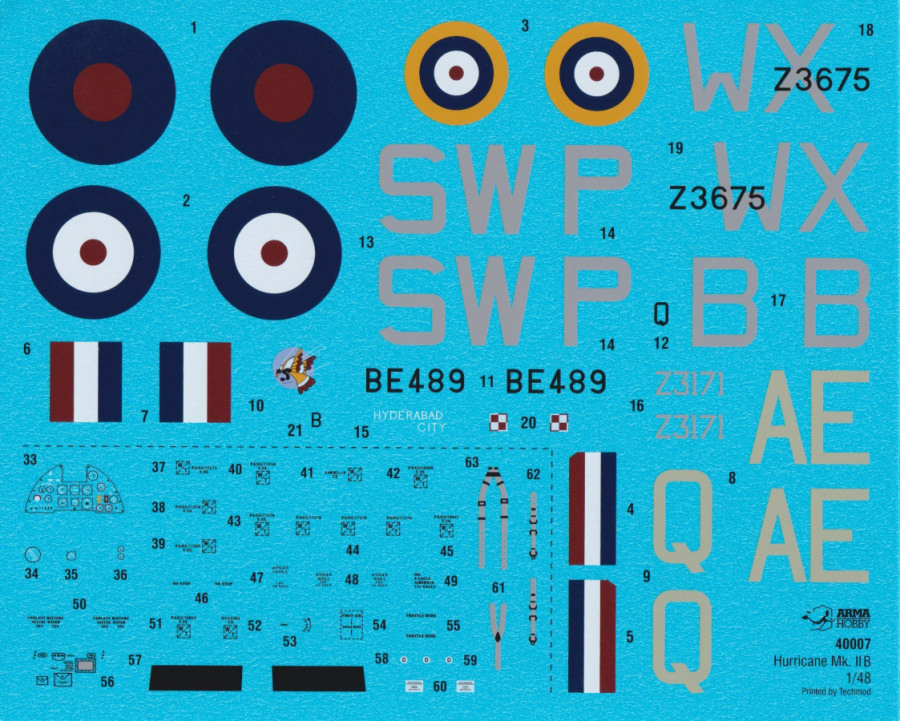 The decals (printed by Techmod) are very well printed, in register, and have accurate colors. They are crisp and bright with minimal carrier film. The instrument panel, seat belts and stencils come on the same sheet. The instructions are well illustrated with a logical, clear build sequence and include a parts map. There are color callouts for Hataka, AK Interactive Real Colors, AMMO (MIG), Mission Models, Humbrol, Vallejo and Tamiya paints.
