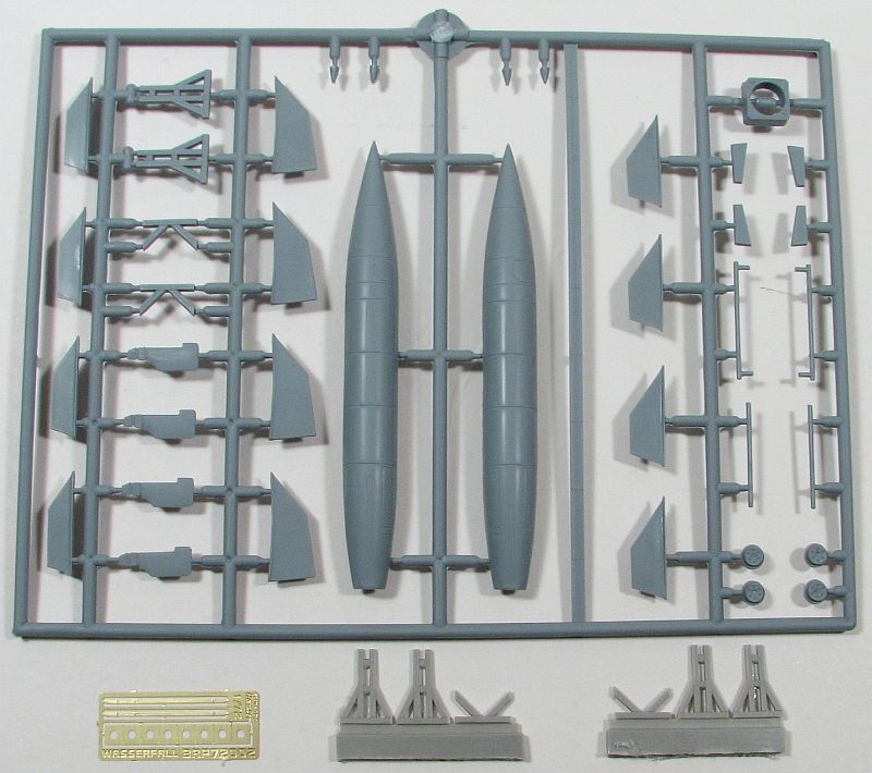 Construction is super simple. The first step is gluing the pieces for the vertical "holder" which when completed will hold the model standing up, if that's how you want to display it. But once that is finished then construction is easy. Glue the two, main body halves together; once those are dried and any seams eliminated, then you glue on the fins and all control surfaces. And now you have a Wasserfall in 1/72. If you want to display the model "horizontally", then you glue the trestle pieces together - three per end - and eventually glue those to the model (after painting the missile, of course). The photoetch pieces are the holder for the end of the rocket, that is attached to the base; and the other two pieces are "straps" to hold the rocket to the trestles, if wanting to display it that way.