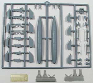 The Brengun 1/72 EMW Wasserfall C2 consists of 31 pieces of gray, injected plastic; six pieces of resin; and a photoetch fret containing 3 pieces. While there are actually 39 pieces of plastic on the sprue, the "extra" pieces are for the trestle the rocket rests on, which are also provided for in resin. It's the resin pieces you truly want to use because the detail on them is much better than the plastic parts.